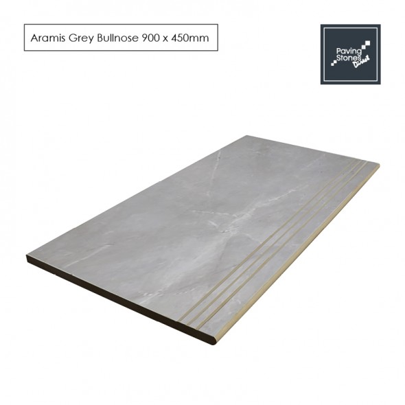 Add character and charm to any Patio with our unique Aramis Grey Porcelain bullnose 900x450 step and riser which is 900mm x 150mm, A clean Grey product with marbling tones.