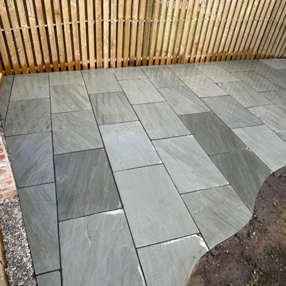 Silver Grey 600x900 Single Size calibrated - It is a beautiful grey sandstone that originates from India from a place called as Kandla, hence popularly known as Kandla Grey or even Promenade as it gives that very warm-ish Promenade look on a sunny morning. It is a very warm colour predominantly grey with slight tones of yellow and browns. It really stands out as a very unique colour after it is laid. It originates from India. It undergoes a Machine technique (i.e) a process of Calibration which gives a line finish on bottom of stone to even out thickness of slabs to 22mm with hand cut edges. Our Natural Stone is high quality for your Patios, Garden Paving and Landscaping Projects from Direct Importers. All our products are suitable for British Weather conditions and they are frost resistant. We can also do Split Packs to match you exact meterage so you don't need to order extra and waste it - Split Pack Fee Applies*.