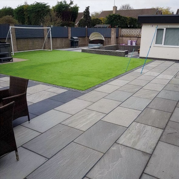 Silver Grey 600x900 Single Size calibrated - It is a beautiful grey sandstone that originates from India from a place called as Kandla, hence popularly known as Kandla Grey or even Promenade as it gives that very warm-ish Promenade look on a sunny morning. It is a very warm colour predominantly grey with slight tones of yellow and browns. It really stands out as a very unique colour after it is laid. It originates from India. It undergoes a Machine technique (i.e) a process of Calibration which gives a line finish on bottom of stone to even out thickness of slabs to 22mm with hand cut edges. Our Natural Stone is high quality for your Patios, Garden Paving and Landscaping Projects from Direct Importers. All our products are suitable for British Weather conditions and they are frost resistant. We can also do Split Packs to match you exact meterage so you don't need to order extra and waste it - Split Pack Fee Applies*.