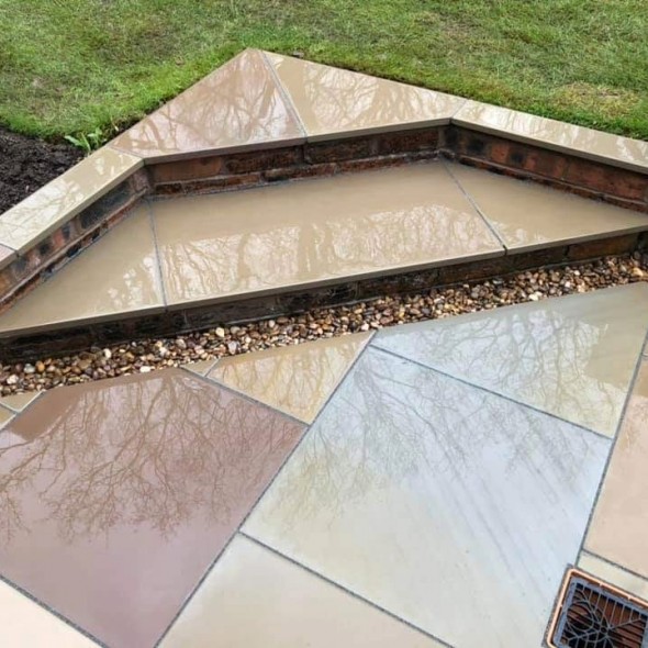 Sawn Raj Green sandstone, finished with a polished, sawn and honed surface, offers a smooth texture and a natural blend of greens, browns, and greys. Its understated tones create a clean, elegant look that suits modern patio designs perfectly.