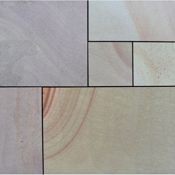 Textured Buff Anti slip 4 Sizes Calibrated sawn edges - It is a beautiful natural looking sandstone that originates from India with predominantly with creams, yellows, buffs, oranges with plenty of natural colour tones and shot blasted texture on top to make it slip-resistant. It really stands out as a very unique colour after it is laid. It undergoes a Machine technique which is a process of Calibration which gives a line finish on bottom of stone to even out thickness of slabs to 20mm with a 2mm tolerance and Sawn edges. It has shot blasted texture on top to make it slip resistant which gives it a very natural character and the sawn edges finish off the look. Our Natural Stone is high quality for your Patios, Garden Paving and Landscaping Projects from Direct Importers. All our products are suitable for British Weather conditions and they are frost resistant. We can also do Split Packs to match you exact meterage so you don't need to order extra and waste it - Split Pack Fee Applies*.